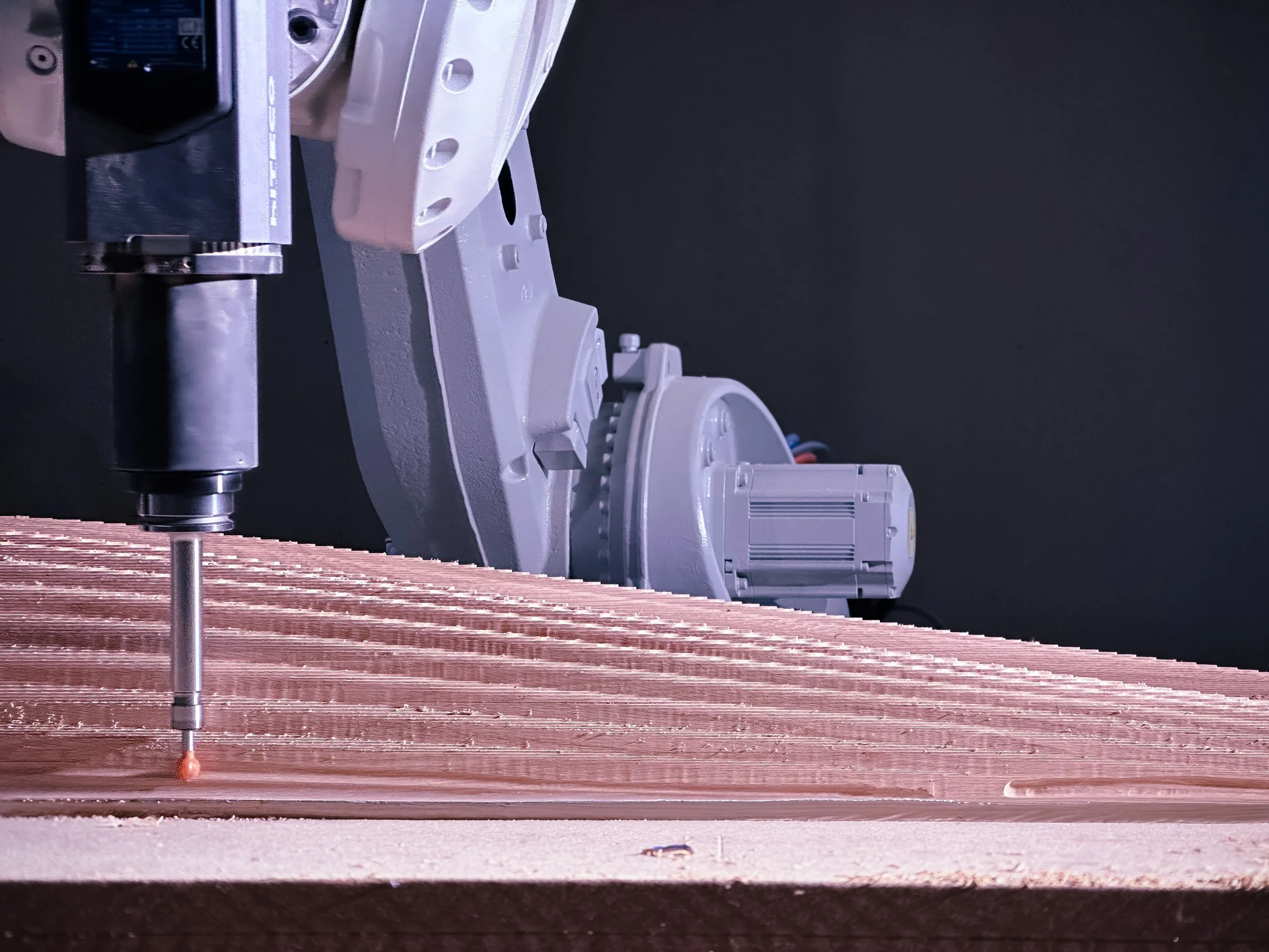 De kern van onze workflow is een 6-assige ABB IRB 6740 robotarm (3 m bereik, 260 kg draagvermogen). Dankzij de OmniCore besturingstechnologie met absolute nauwkeurigheid stelt dit systeem ons in staat om complexe, grootschalige geometrieën te realiseren via uiterst precies 5-assig CNC-frezen.